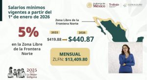 En el caso de la Zona Libre de la Frontera Norte, el incremento será de 5%, pasando de 419.88 a 440.87 pesos diarios, equivalentes a 13,409.80 pesos mensuales.