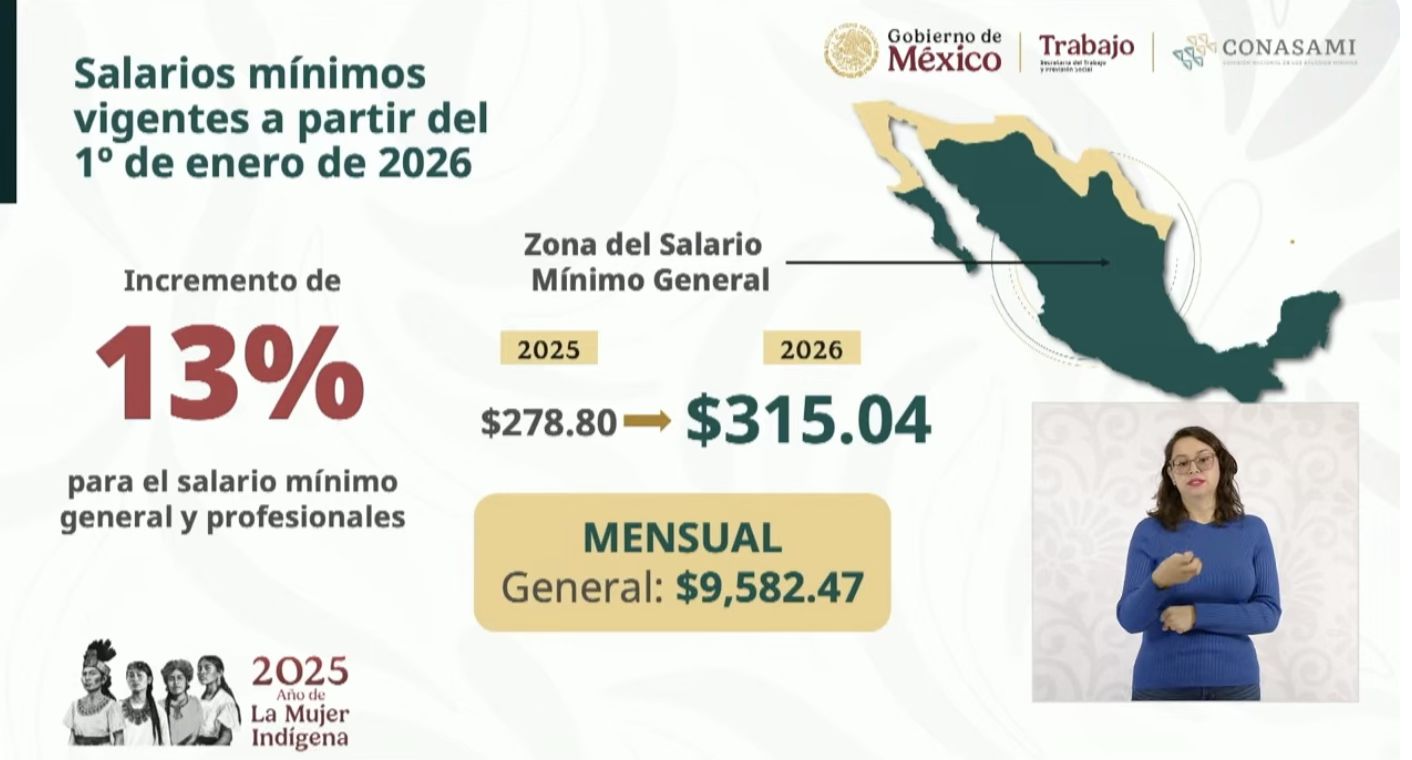 El titular de la Secretaría del Trabajo y Previsión Social (STPS), Marath Bolaños, detalló que el incremento permitirá elevar el salario mínimo general de 278.80 pesos a 315.04 pesos diarios, lo que equivale a un ingreso mensual de 9,582.47 pesos.